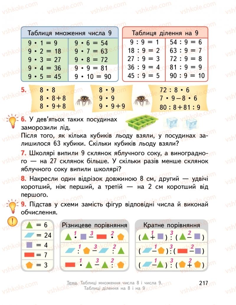 Урок 98. Таблиці множення числа 8 і числа 9. Таблиці ділення на 8 і на 9стр. 216 - 217